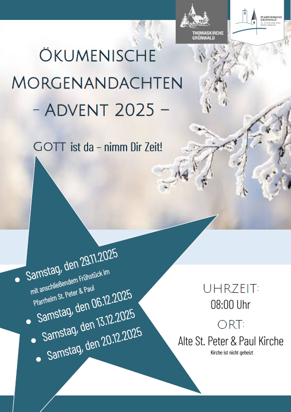 Ökumenische MorgenandachtAlte PfarrkircheSamstag, den 29.11.2025 um 08:00 Uhrmehr