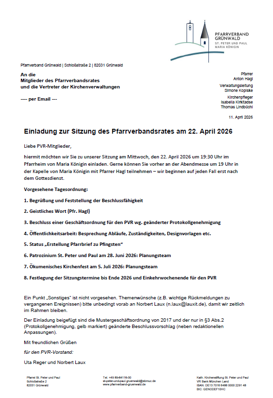 Am 19. März 2026 ist unser langjähriger Pfarrer und Pfarrverbandsleiter Pater Anton Lötscher gestorben. Die Beerdigung fand statt am Montag, den 23. März 2026 auf dem Klosterfriedhof der Oblaten in Hünfeld bei Fulda. Hier in Grünwald feierten wir ein Requiem in der Abendmesse in St. Peter und Paul am Freitag, den 27. März 2026, das musikalisch besonders gestaltet wurde. Einen Nachruf auf Pater Lötscher finden Sie hier.